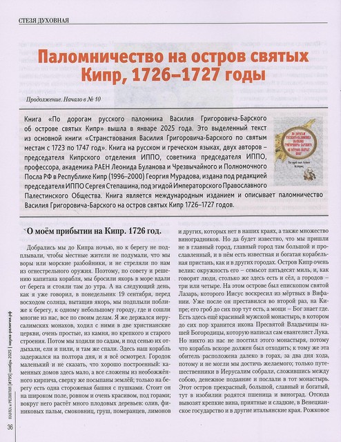 Фрагмент, который представлен в статье из книги «По дорогам русского паломника Василия Григоровича-Барского об острове святых Кипр», книга вышла в январе 2025 года. Это выделенный текст из основной книги Василия Григоровича-Барского «Странствования Василия Григоровича-Барского по святым местам с 1723 по 1747 год». Книга на русском и греческом языках, двух авторов председателя Кипрского отделения ИППО, советника Председателя ИППО, профессора, академика РАЕН — Леонида Буланова и Чрезвычайного и Полномочного Посла РФ в Республике Кипр /1996-2000 гг./ — Георгия Мурадова, книга издана под редакцией Председателя ИППО Сергея Степашина, под эгидой